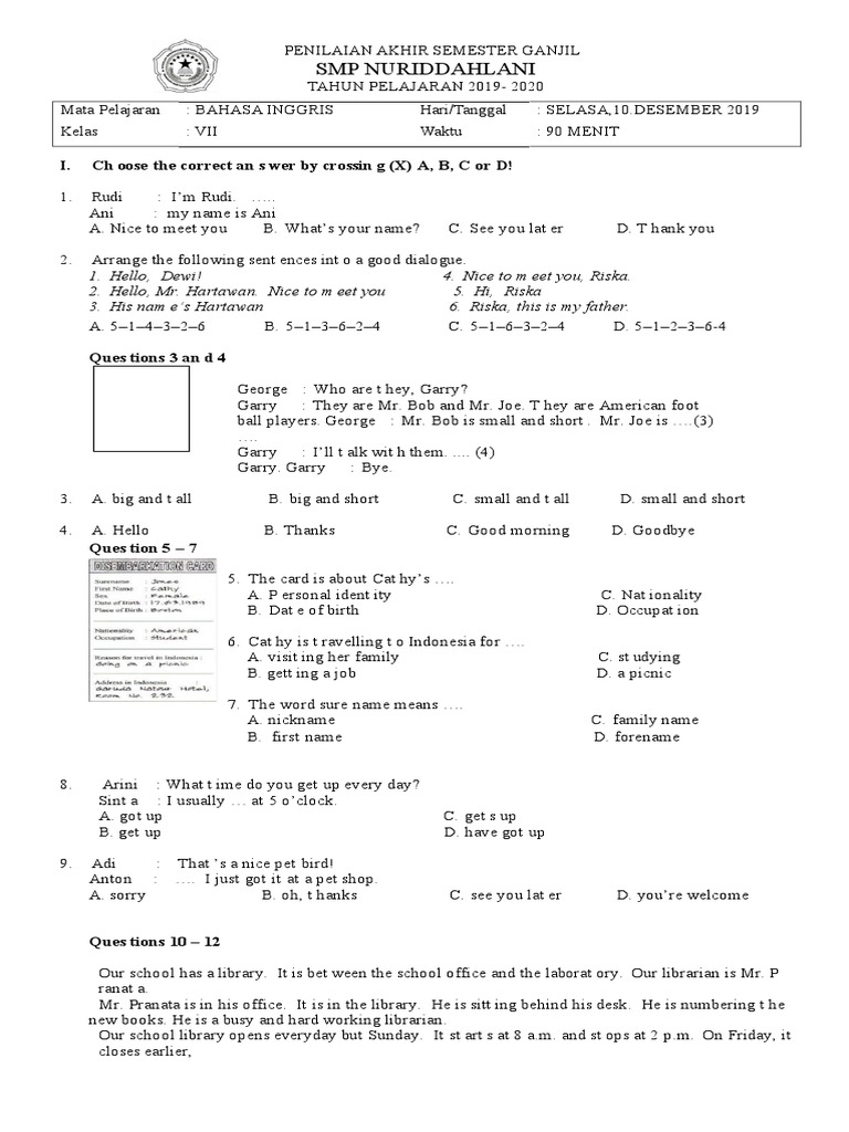 Choose the correct response by crossing a the choice a w chemical ór d. 10 Soal Pilihan Ganda Bahasa Inggris Untuk SMP Kelas 7 Part II Beserta Jawaban. Soal ukk kelas 7 kurikulum 2013 tahun 2019 Mata Pelajaran Bahasa Indonesia.