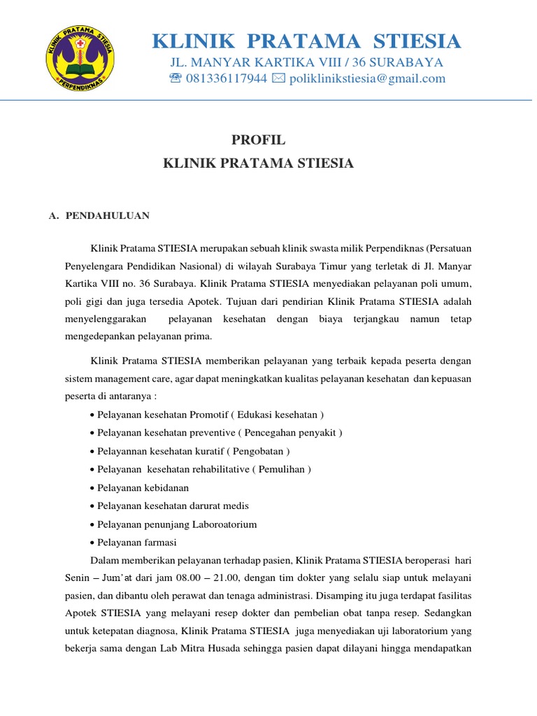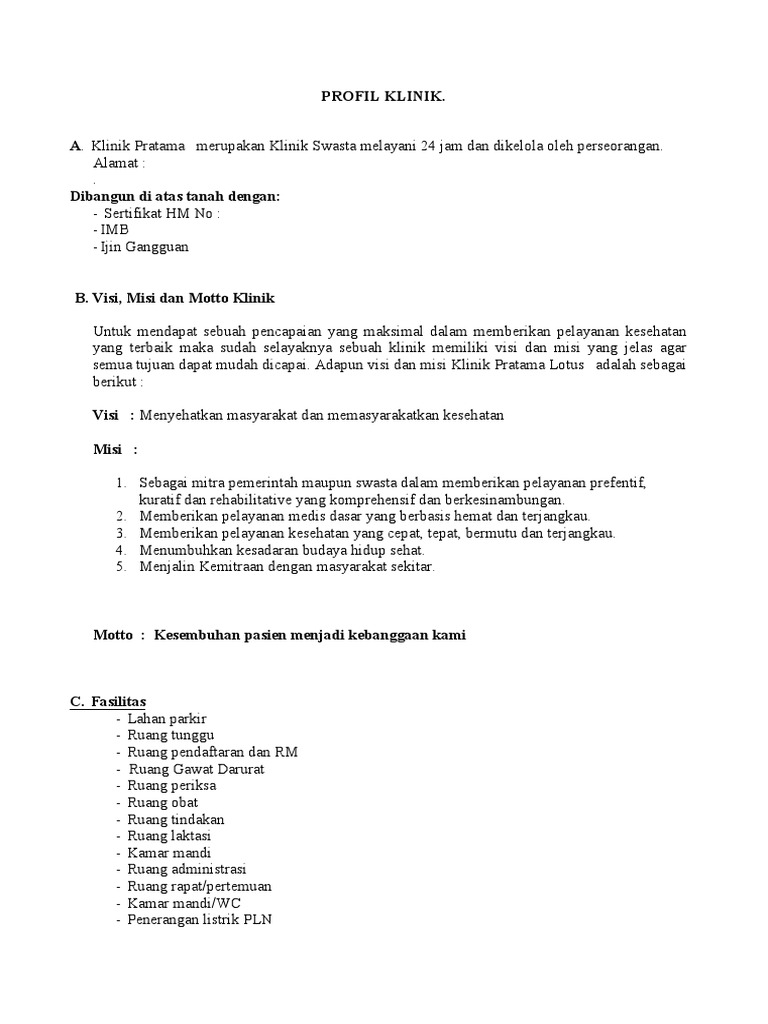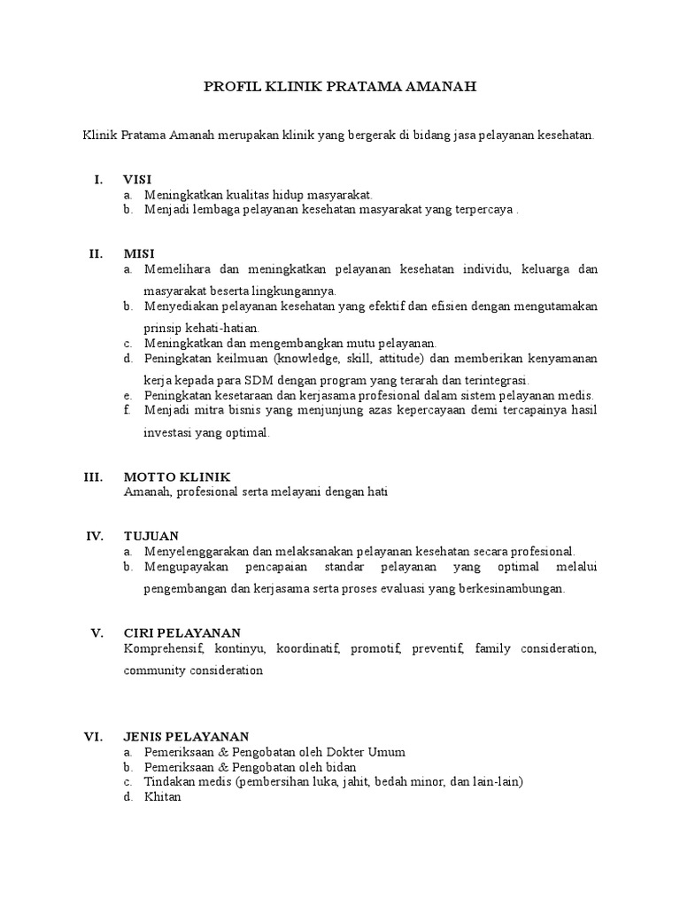Contoh profil klinik. If you are author or own the copyright of this book please report to us by using this DMCA report form. Jalan Ramba 1 No. Profil klinik Klinik Yuliarpan Medika merupakan suatu b adan usaha yang khusus bergerak dalam bidang pelayanan kesehatan.