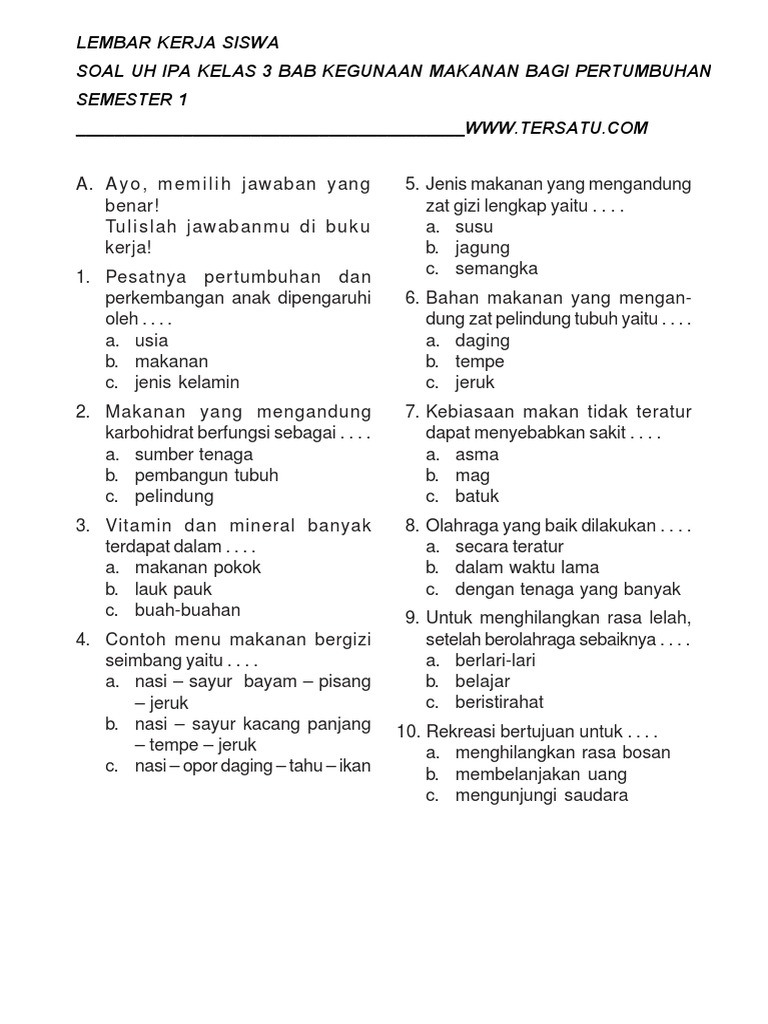 Soal Uh Ipa Kelas 3 Bab 6 Kegunaan Makanan Bagi Pertumbuhan Semester 1